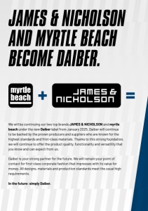 + = JAMES & NICHOLSON AND MYRTLE BEACH BECOME DAIBER. We will be continuing our two top brands JAMES & NICHOLSON and myrtle beach under the new Daiber label from January 2025. Daiber will continue to be backed by the proven producers and suppliers who are known for the highest standards and first-class materials. Thanks to this strong foundation, we will continue to offer the product quality, functionality and versatility that you know and can expect from us. Daiber is your strong partner for the future. We will remain your point of contact for first-class corporate fashion that impresses with its value for money. All designs, materials and production standards meet the usual high requirements. In the future: simply Daiber.